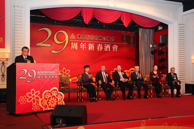 街總廿九周年會慶暨新春酒會昨日下午四時假萬豪軒酒家舉行。行政長官崔世安,全國政協副主席何厚鏵,中聯辦副主任徐澤,外交部駐澳副特派員 張金鳳,國家民政部政策研究中心主任王愛平,由街總榮譽會長劉光普、會長姚鴻明陪同主禮。全國政協常委廖澤雲,社會文化司司長張裕、行政長官辦公室主任譚 俊榮等官員及各界社會賢達、社團代表出席致賀。